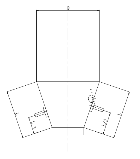 3、振打氣錘的安裝位置要合理,不合理的安裝位置,既削弱了振動力,又損害了氣錘本身。如圖2,不要對稱安裝,要交叉安裝,另外不要少于L/3,否則影響振動力。